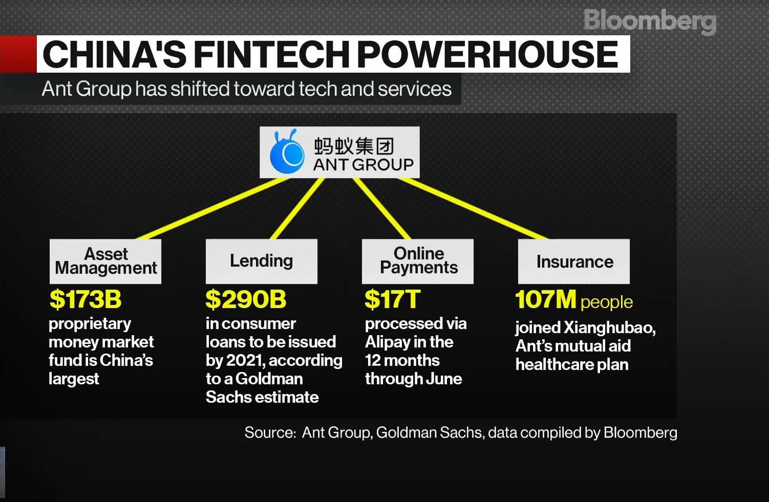 La valorización de la empresa de fintech china Ant group o Grupo Hormiga en español supera a JP Morgan así como empresas como BBVA o Santander y en esta semana se frustro su salida a bolsa mediante una IPO al mismo tiempor en las bolsas de Shanghai y Hong Kong por 35.000 millones de dólares, la que iba a ser la más grande de la historia, y se frustró luego que el Banco Central Chino publicó un borrador de reglas para regular los microcréditos on line y que potencialmente afectaría el negocio de Ant Group.